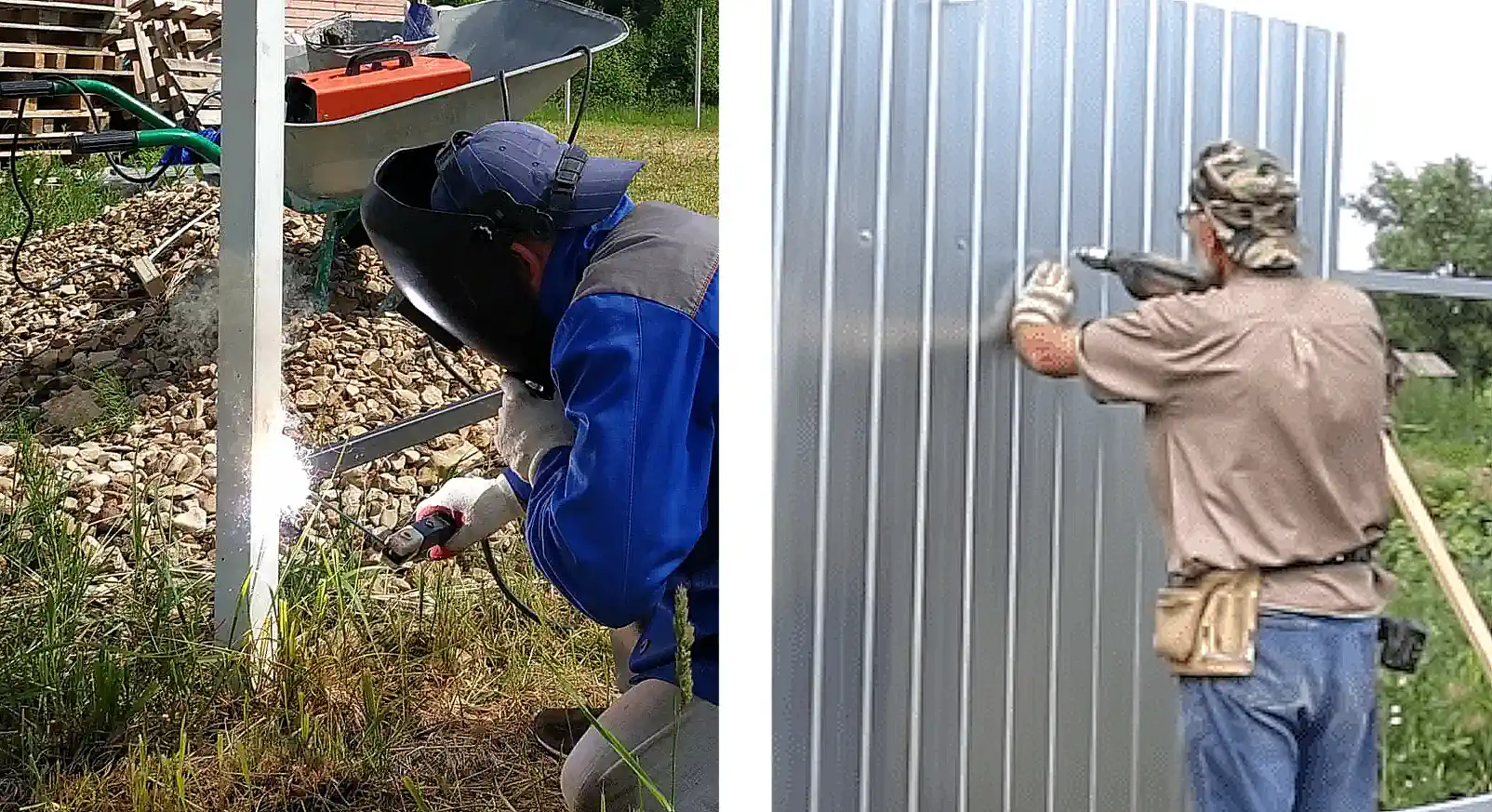 Когда все столбы выставлены, выполняются сварочные работы, а именно монтаж поперечных лаг. При заборе высотой не более 2 метров, лаги устанавливаются в два ряда. Этого вполне достаточно, для обеспечения жесткости конструкции.