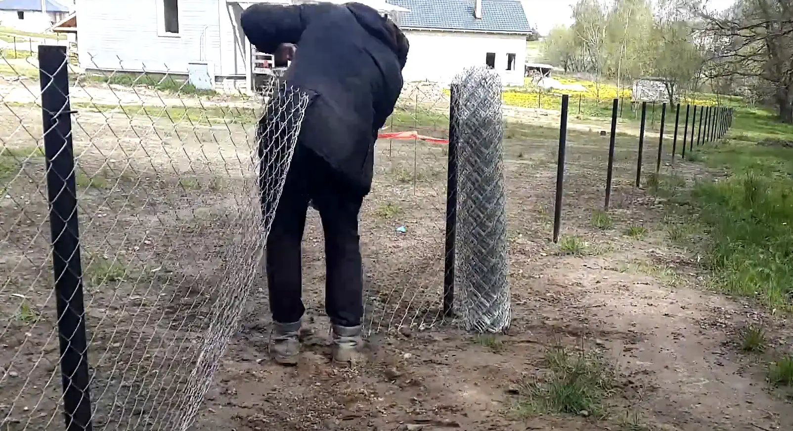 Важно чтобы сетка была равномерно натянута. Места соединения сетки сплетается между собой в единое полотно. Для фиксации сетки рабица используются специальные крючки приваренные к столбам.
