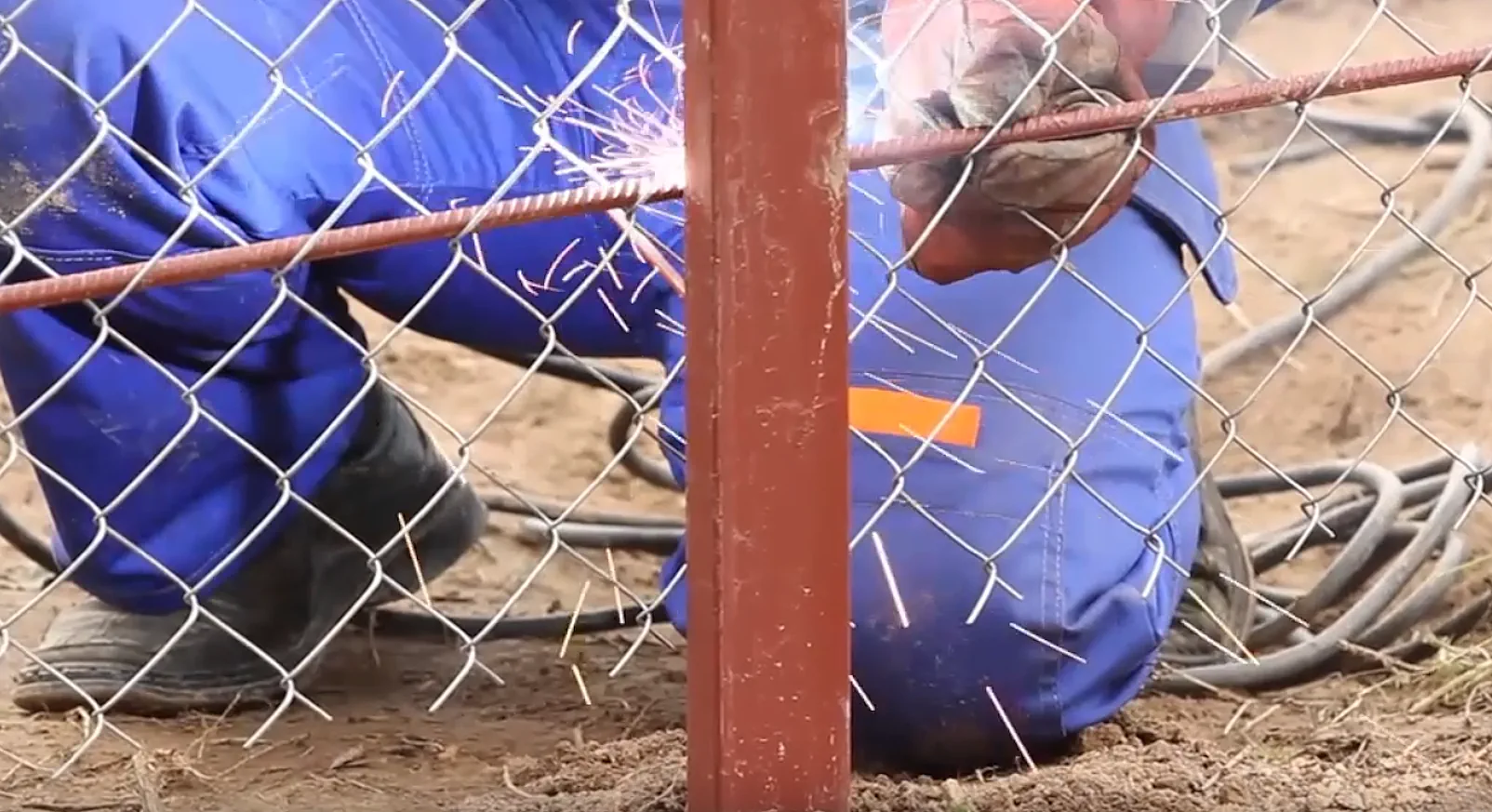 Прут протягивается через ячейки сетки, приваривается к столбам и между собой с помощью электросварки. Места сварки отбиваются от шлака и покрываются защитным покрытием.