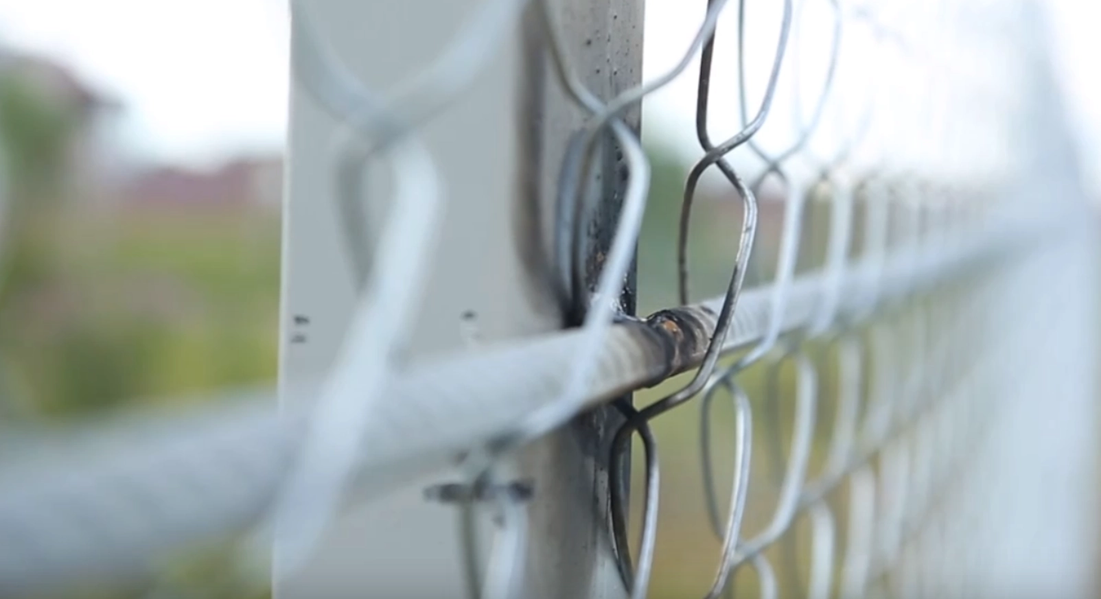 После установки сетки рабица, по желанию заказчика, проводится ее дополнительная фиксация. Протягивается арматурный прут диаметром 10мм.